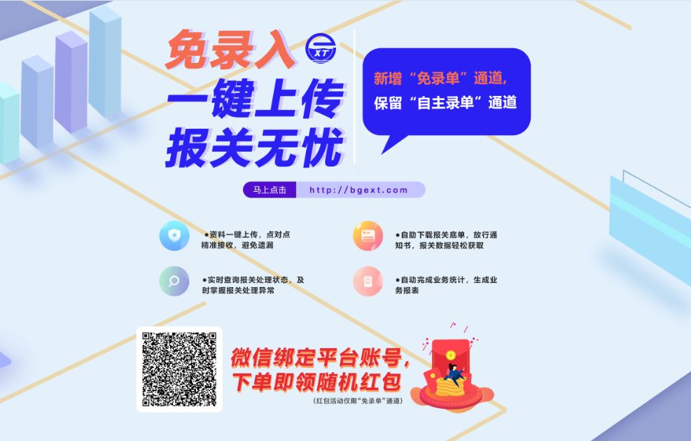 报关一线通开启双通道模式,即日起新增“免录单”通道,同时保留原“自主录单”通道。微信绑定平台账号,“免录单”通道下单即领随机红包!
