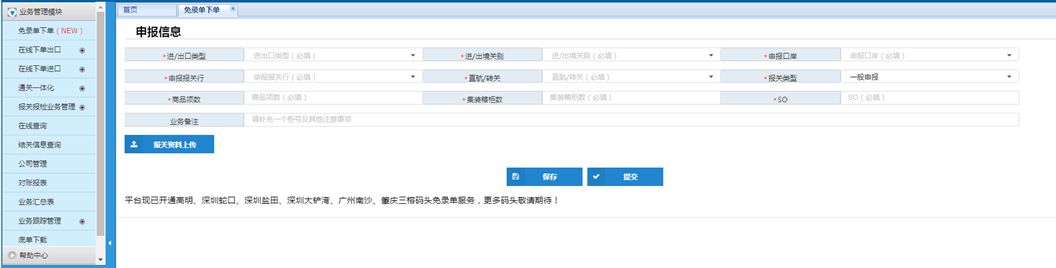 客户通过【免录单下单】模块,直接上传报关资料,委托平台供应商完成报关的模式。按根据选项填写报关资料,点击提交,一键上传,完成委托!